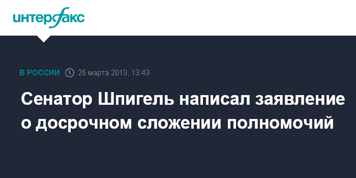 Москва. 25 марта. INTERFAX.RU - Сенатор Борис Шпигель отправил в комитет верхней палаты по регламенту заявление о досрочном сложении полномочий члена Совета Федерации.