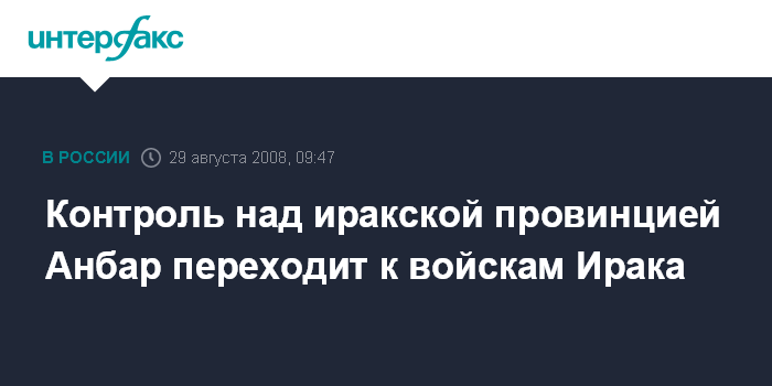 Москва. 29 августа. INTERFAX.RU - Коалиционные войска США в ближайший понедельник намерены полностью передать контроль над иракской провинцией Анбар, где проживает суннитское большинство, в ведение иракских военных, сообщил в четверг американский телеканал Си-эн-эн со ссылкой на представителей вооруженных сил США.