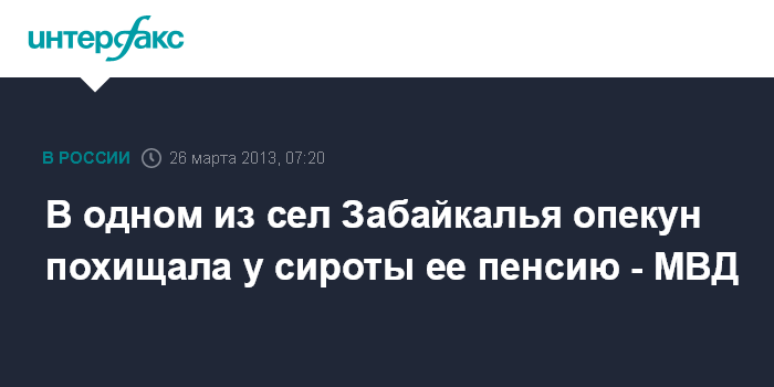 Чита. 26 марта. ИНТЕРФАКС-СИБИРЬ - В селе Алеур Забайкальского края опекун подозревается в хищении более 300 тыс. рублей у сироты - своей несовершеннолетней племянницы, сообщает пресс-служба краевого МВД.