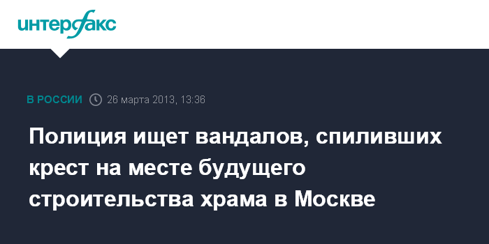 Москва. 26 марта. INTERFAX.RU - Неизвестные граждане спилили поклонный крест, установленный на месте строительства будущего храма на юго-востоке Москвы, сообщили "Интерфаксу" в пресс-службе столичного главка МВД.