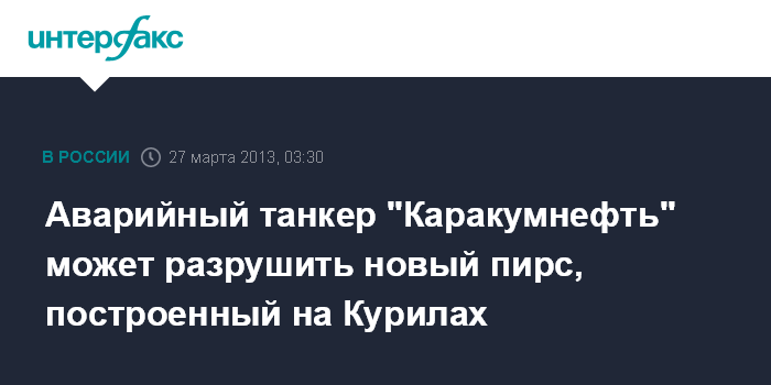 Южно-Сахалинск. 27 марта. ИНТЕРФАКС-ДАЛЬНИЙ ВОСТОК - Аварийный танкер "Каракумнефть", севший в феврале 2012 года на мель возле о. Итуруп (средние Курилы - ИФ), штормом в любой момент может выбросить на новый пирс, построенный в порту города Курильска, сообщил журналистам руководитель агентства по развитию Курильских островов и инвестиционных программ Сахалинской области Сергей Абабков.
