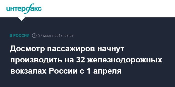 Москва. 27 марта. INTERFAX.RU - С 1 апреля на 32 российских железнодорожных вокзалах в тестовом режиме начнут действовать досмотровые зоны для пассажиров, на обустройство которых было потрачено более 1 млрд рублей, пишет "Коммерсант" в среду.