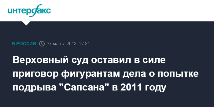 Москва. 27 марта. INTERFAX.RU - Верховный суд РФ в среду признал законным приговор фигурантам дела о попытке подрыва скоростного поезда "Москва - Санкт-Петербург" летом позапрошлого года.