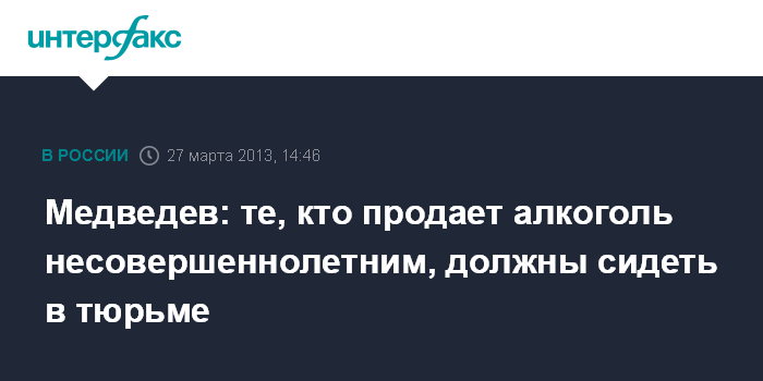 Москва.27 марта. INTERFAX.RU - Премьер-министр России Дмитрий Медведев выступает за введение уголовной ответственности за продажу алкоголя несовершеннолетним.