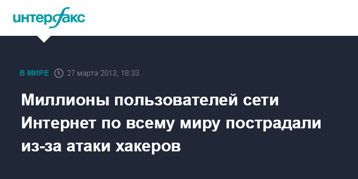 Вашингтон. 27 марта. INTERFAX.RU - Миллионы интернет-пользователей по всему миру ощутили серьезные проблемы с использованием сети из-за атаки хакеров, сообщило в среду агентство Bloomberg. В частности, в среду наблюдались перебои с доступом к ряду сайтов, а также снизилась скорость Интернета.