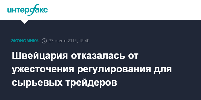 Берн. 27 марта. INTERFAX.RU - Правительство Швейцарии отказалось переходить на более жесткое регулирование деятельности сырьевых трейдеров, включая Vitol SA, Glencore International Plc и Trafigura Beheer BV, вместо этого трейдерам предложено добровольно принять кодекс отраслевой практики и двигаться в сторону большей прозрачности.