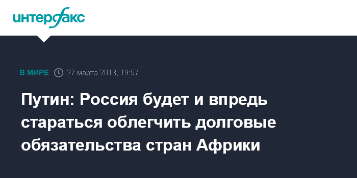 Дурбан (ЮАР). 27 марта. INTERFAX.RU - Россия продолжит усилия по облегчению долгового бремени африканских стран, сообщил президент России Владимир Путин.