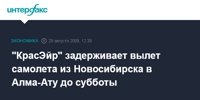 Москва. 29 августа. INTERFAX.RU - Рейс Новосибирск - Алма-Ата ОАО "Авиакомпания "Красноярские авиалинии" ("КрасЭйр") вылетит не в 18:00 по местному времени, а в 5:00 субботы, сообщила агентству "Интерфакс" руководитель пресс-службы "КрасЭйр" Людмила Ганжурова. По ее словам, задержка связана не только с задолженностью заправщикам, но и с технической невозможностью обслуживания самолетов по расписанию из-за задержек.