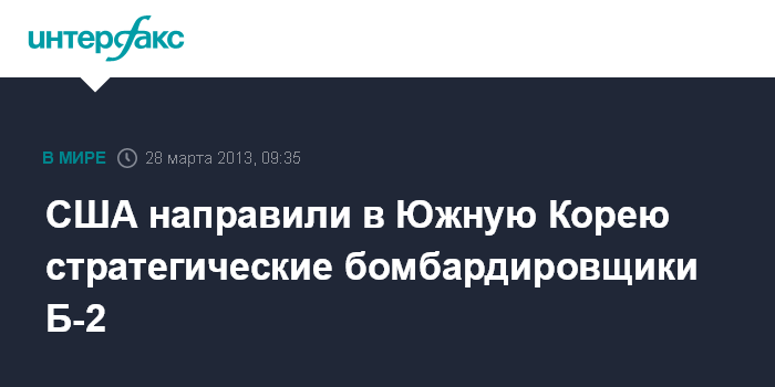 Сеул. 28 марта. INTERFAX.RU - Два стратегических бомбардировщика Б-2 ВВС США, способных нести ядерное оружие, в четверг вылетели с американской военной базы "Уайтмен" в Южную Корею, сообщило американское военное командование в Южной Корее.