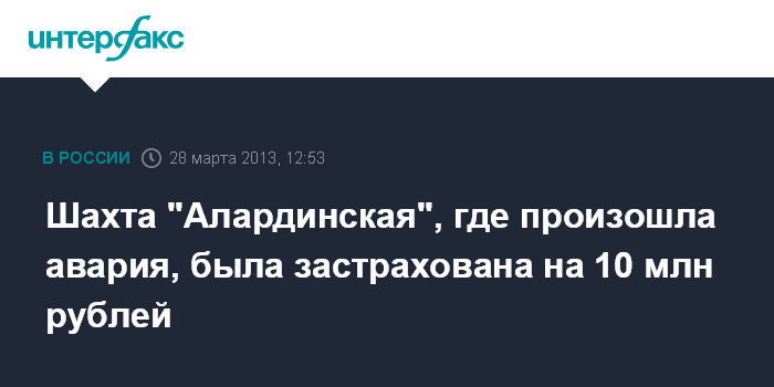 Москва. 28 марта. INTERFAX.RU - Шахта "Алардинская" (входит в ОАО "Объединенная угольная компания "Южкузбассуголь") в Кемеровской области, где в четверг произошла авария, была застрахована по договору обязательного страхования ответственности владельцев опасных объектов (ОПО) в "СОГАЗе" на 10 млн рублей, сообщил агентству "Интерфакс-АФИ" источник на рынке ОПО.