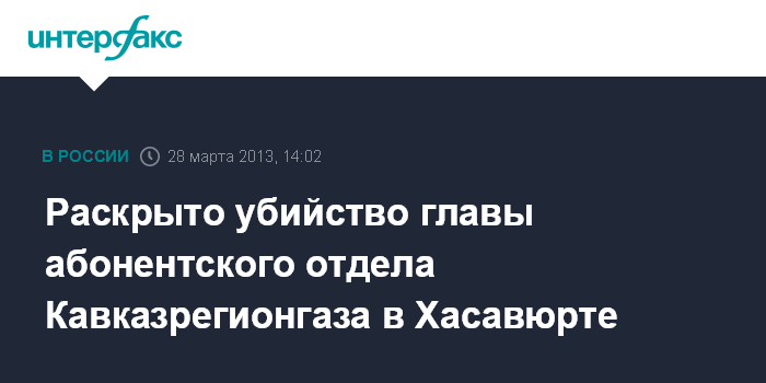 Махачкала/Пятигорск. 28 марта. INTERFAX.RU - Один из участников убийства главы хасавюртовского городского абонентского отдела "Кавказрегионгаза" Юсупа Гаджиева, совершенного накануне, задержан, преступление раскрыто, заявили "Интерфаксу" в Следственном управлении СКР по Дагестану.