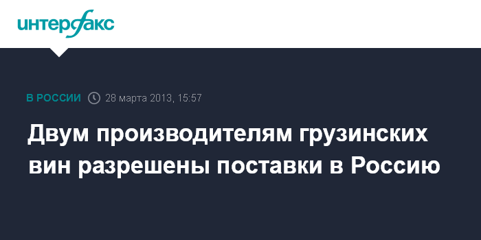 Москва. 28 марта. INTERFAX.RU - Роспотребнадзор дал "зеленый свет" двум грузинским производителям на начало поставок винной продукции на российский рынок.
