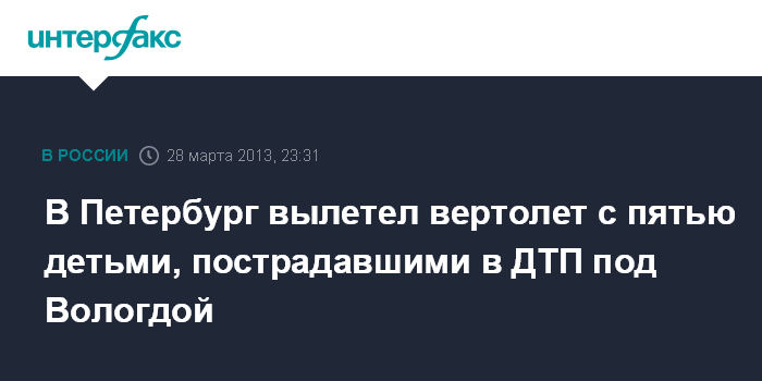 Санкт-Петербург. 28 марта. INTERFAX.RU - Вертолет МЧС РФ вылетел из Череповца, на его борту пятеро детей, пострадавших в ДТП с автобусом, и медики, сообщили "Интерфаксу" в пресс-службе МЧС РФ по Петербургу.