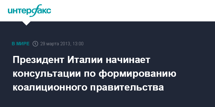 Рим. 29 марта. INTERFAX.RU - Президент Италии Джорджо Наполитано в пятницу приступает к переговорам с лидерами ведущих партий по вопросу формирования правительства, сообщает агентство EFE.