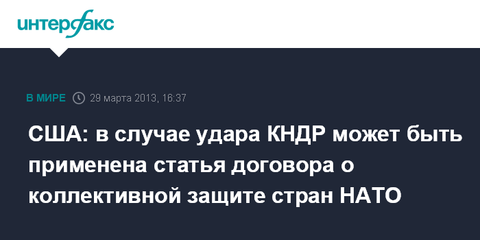 Москва. 29 марта. INTERFAX.RU - Атака на военные объекты США со стороны КНДР гипотетически может повлечь за собой применение 5-й статьи Вашингтонского договора, предусматривающей коллективную защиту территории страны-члена НАТО, заявил заместитель генсека НАТО Александр Вершбоу.