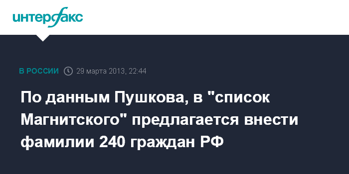 По данным Пушкова, в "список Магнитского" предлагается внести фамилии 240 граждан РФ
