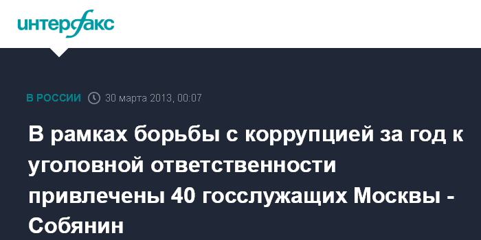 "В частности, за последний год только было привлечено к уголовной ответственности 40 государственных служащих Москвы. Это не какие-то там клерки, это уровень заместителей префектов, глав управ, заместителей глав управ, это работники учреждений, руководители учреждений", - рассказал С.Собянин в интервью телеканалу "НТВ" в пятницу.