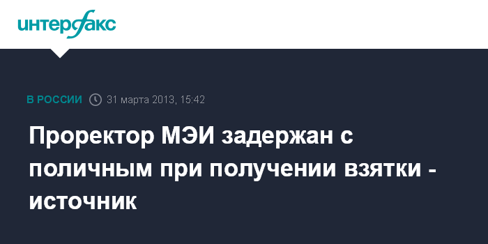 Москва. 31 марта. INTERFAX.RU - Проректор Московского энергетического института задержан с поличным при получении взятки, сообщил "Интерфаксу" источник в правоохранительных органах. Вместе с ним задержан посредник, 50-летний экономист подчиненного ему отдела МЭИ. Возбуждено уголовное дело - по статьям "получение взятки" и "посредничество в получении взятки.