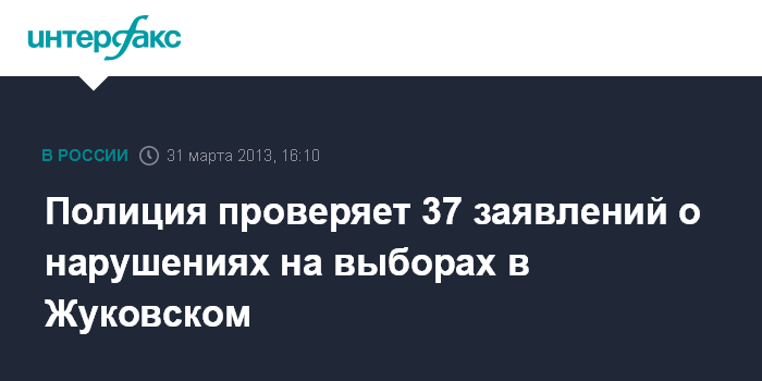 Жуковский. 31 марта. INTERFAX.RU - Почти 40 заявлений о нарушениях на выборах в подмосковном Жуковском поступило в правоохранительные органы, сообщили в пресс-службе ГУ МВД по Московской области. "По состоянию на 15:30 к нам поступило 37 заявлений о предполагаемых нарушениях на выборах мэра города", - сообщил сотрудник пресс-службы "Интерфаксу" в воскресенье.