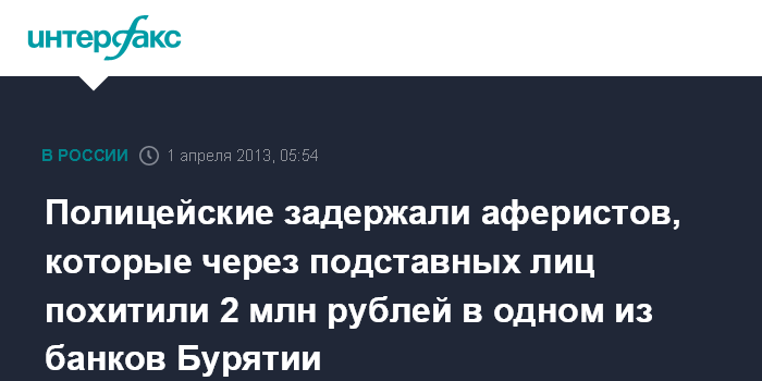 Чита. 31 марта. ИНТЕРФАКС-СИБИРЬ - В Бурятии полицейские задержали преступную группу, которая за полгода похитила около 2 млн рублей в одном из банков, сообщает пресс-служба республиканского МВД.