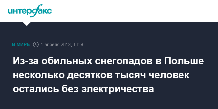 Варшава. 1 апреля. INTERFAX.RU - Более 80 тыс. человек остались без элекрообеспечения из-за сильных снегопадов в Польше, сообщает в понедельник польский телеканал ТВН24.