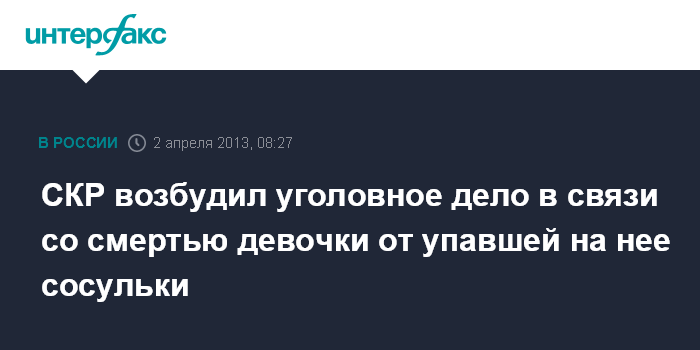 Москва. 2 апреля. INTERFAX.RU - В связи с гибелью в Калужской области 7-летней девочки от упавшей на нее сосульки возбуждено уголовное дело, сообщили в региональном управлении СКР.