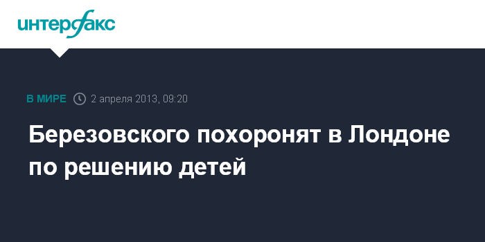 Москва. 2 апреля. INTERFAX.RU - Скончавшийся в Лондоне бизнесмен Борис Березовский будет похоронен в британской столице, сообщает телеканал "Дождь" со ссылкой на источник, близкий к его семье.
