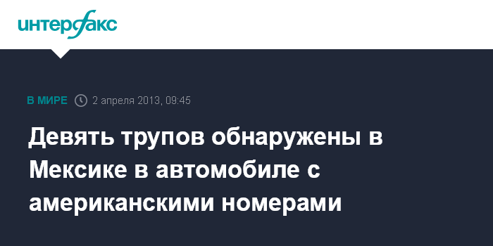 Мехико. 2 апреля. INTERFAX.RU - Тела девяти мужчин найдены в автомобиле с американскими номерами в мексиканском штате Тамаулипас на северо-востоке страны, сообщили в местной прокуратуре.