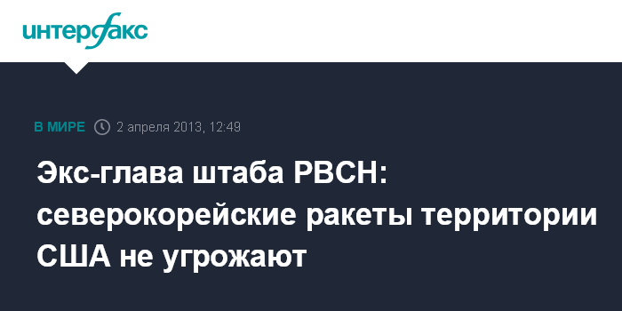 Москва. 2 апреля. INTERFAX.RU - КНДР не располагает возможностями для нанесения удара по западному побережью США, заявил бывший начальник штаба Ракетных войск стратегического назначения генерал-полковник Виктор Есин.