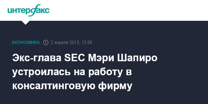 Вашингтон. 2 апреля. INTERFAX.RU - Бывший председатель Комиссии по ценным бумагам и биржам (SEC) США Мэри Шапиро, четыре месяца назад оставившая свой пост, устроилась на работу в консалтинговую фирму Promontory Financial Group LLC.