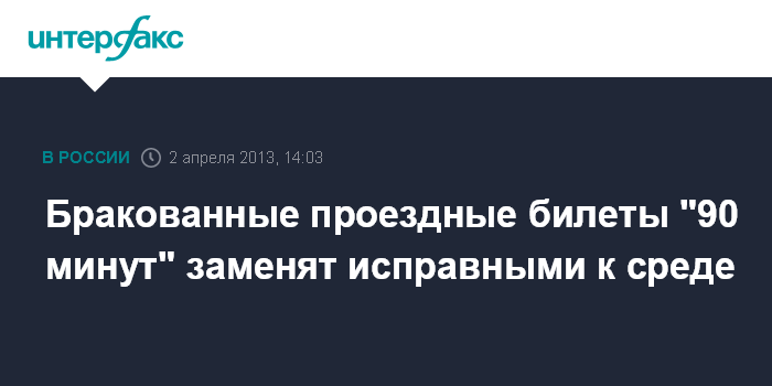 Как сообщили "Интерфаксу" в пресс-центре департамента во вторник, по причине заводского брака билеты "90 минут" не функционируют в полном объеме. "Остальные нововведенные билеты, в том числе билет "90 минут", купленный в кассах московского метрополитена и в автоматизированных кассах "Мосгортранса", действуют исправно", - пояснили в пресс-центре.
