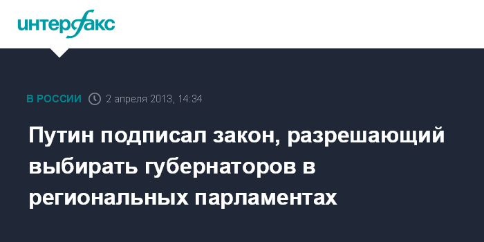 Москва. 2 апреля. INTERFAX.RU - Президент России Владимир Путин подписал закон, наделяющий субъекты России правом выбирать губернатора не прямым голосованием населения региона, а местным парламентом.