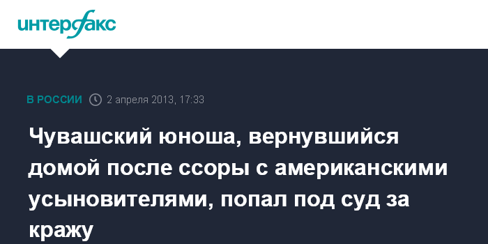 Чебоксары. 2 апреля. INTERFAX.RU - Александр Абносов, усыновленный в 12-летнем возрасте семьей из США и недавно вернувшийся в Россию, предстанет в Чебоксарах перед судом по обвинению в попытке кражи.