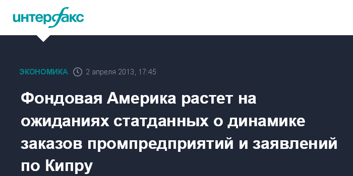 2 апреля. FINMARKET.RU - Фондовые индексы США растут в начале торгов во вторник на ожиданиях позитивных статданных о динамике заказов промпредприятий в стране и заявлений международных кредиторов по Кипру, сообщает агентство Bloomberg.