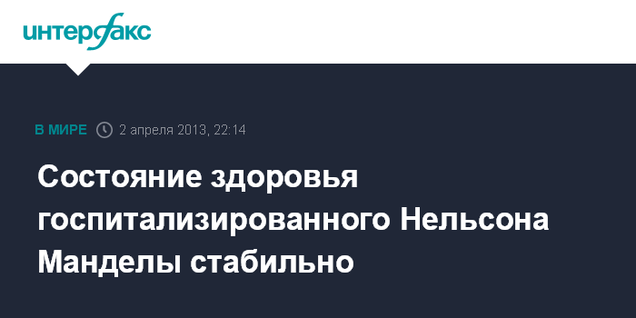 Йоханнесбург. 2 апреля. INTERFAX.RU - Состояние здоровья бывшего президента ЮАР Нельсона Манделы остается стабильным, ухудшений не наблюдается, говорится в распространенном во вторник заявлении администрации южноафриканского президента Джейкоба Зумы.