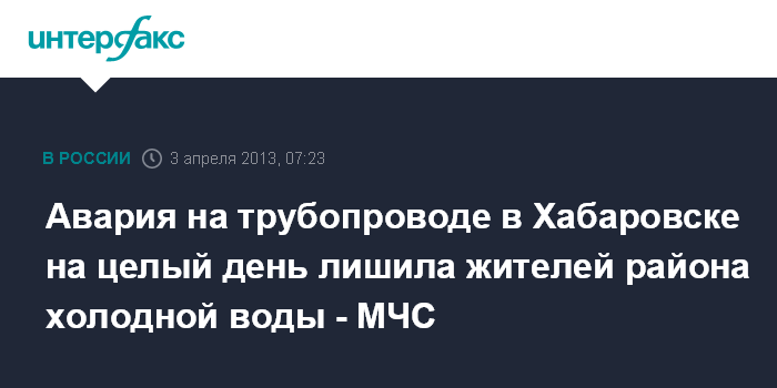 Хабаровск. 3 апреля. ИНТЕРФАКС-ДАЛЬНИЙ ВОСТОК - В Хабаровске произошел порыв трубопровода холодного водоснабжения, сообщает официальный сайт МЧС России в среду.