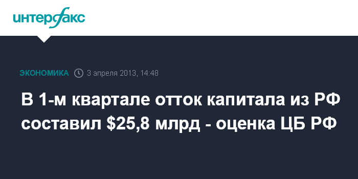 3 апреля. FINMARKET.RU - В 1-м квартале 2013 году чистый отток капитала из РФ составил $25,8 млрд. Об этом свидетельствуют опубликованные ЦБ РФ предварительные данные о чистом ввозе/вывозе капитала частным сектором (по данным платежного баланса).