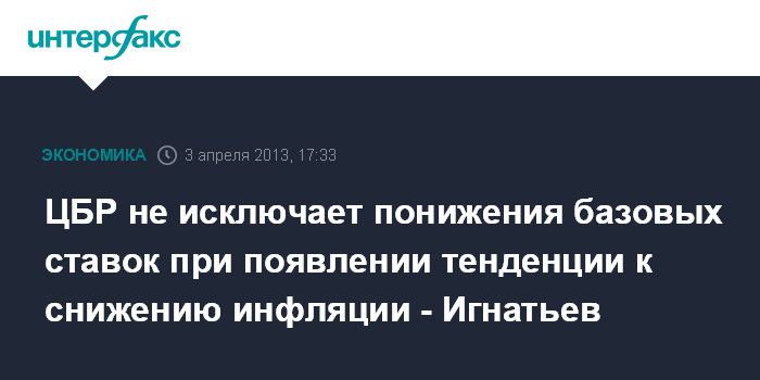 ЦБР не исключает понижения базовых ставок при появлении тенденции к снижению инфляции - Игнатьев