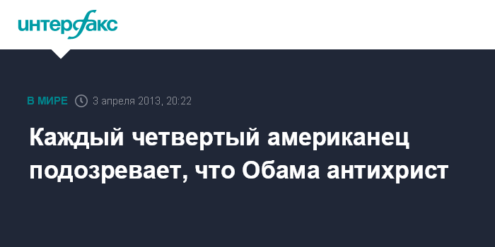 Вашингтон. 3 апреля. INTERFAX.RU - Четвертая часть граждан США полагают, что президент страны Барак Обама может быть антихристом, свидетельствуют результаты опроса, опубликованного в среду американской организацией Public Policy Polling.