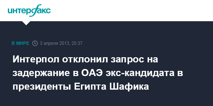 Каир. 3 апреля. INTERFAX.RU - Международная организация уголовной полиции (Интерпол) отклонила запрос Каира на задержание и выдачу Египту бывшего кандидата на пост президента Ахмада Шафика, сообщает в среду местная газета Al Ahram.