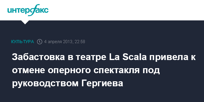 Рим. 4 апреля. INTERFAX.RU - Намеченный на ближайшее воскресенье в миланском театре La Scala показ оперного спектакля "Макбет" под руководством российского дирижера Валерия Гергиева отменен в связи с забастовкой, говорится в заявлении, опубликованном на веб-сайте театра.