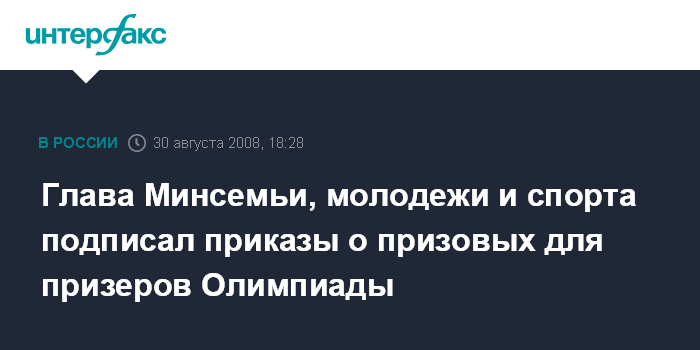 Москва. 30 августа. INTERFAX.RU - Министр Украины по делам семьи, молодежи и спорта рий Павленко подписал приказы министерства о выплате вознаграждений спортсменам национальной олимпийской сборной команды, которые заняли призовые места на играх XXIX Олимпиады в Пекине.