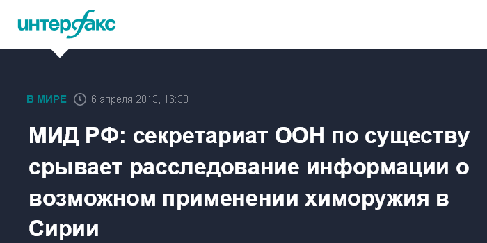 Москва. 6 апреля. INTERFAX.RU - В Москве считают, что Секретариат ООН занял неконструктивную и непоследовательную позицию по вопросу расследования возможного применения химического оружия в Сирии. "В Москве вызывает серьезную обеспокоенность непонятное маневрирование руководства Секретариата ООН с организацией расследования возможного применения в Сирийской Арабской Республике химического оружия", - говорится в комментарии Департамента информации и печати МИД, размещенном в субботу на сайте ведомства .