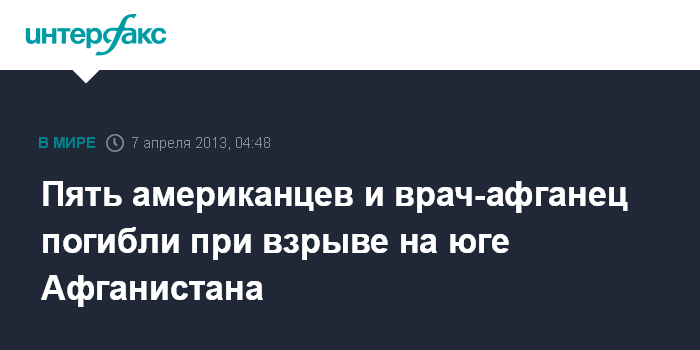 Лондон. 7 апреля. ИНТЕРФАКС - На юге Афганистана в провинции Забул при взрыве заминированного автомобиля погибли пять американцев и один врач-афганец, сообщает британская телерадиовещательная корпорация Би-би-си со ссылкой на госсекретаря США Джона Керри.
