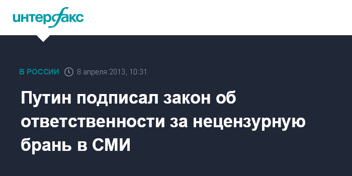 Москва. 8 апреля. INTERFAX.RU - Президент России Владимир Путин подписал закон, которым вводится ответственность за нецензурную брань в СМИ, сообщает сайт Кремля.