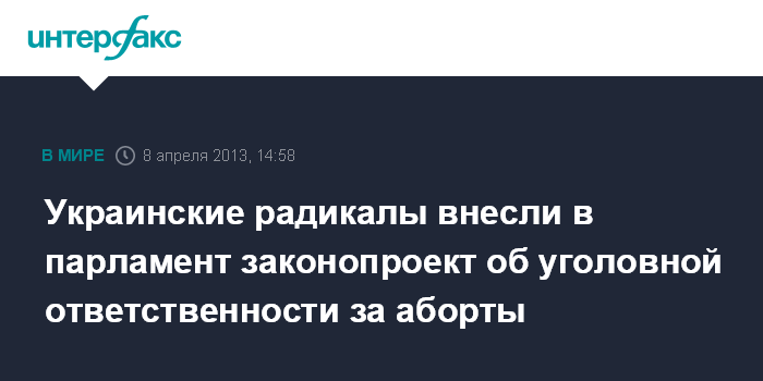 Киев. 8 апреля. INTERFAX.RU - Народные депутаты фракции "Свобода" предлагают запретить искусственное прерывание беременности на Украине, а за проведение абортов, кроме случаев, предусмотренных законодательством, ввести уголовную ответственность.