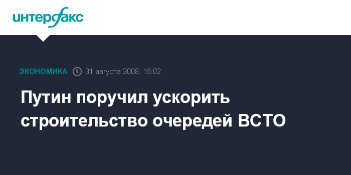 Находка. 31 августа. INTERFAX.RU - Председатель правительства РФ Владимир Путин требует не допустить задержек строительства нефтепровода Восточная Сибирь - Тихий океан (ВСТО).