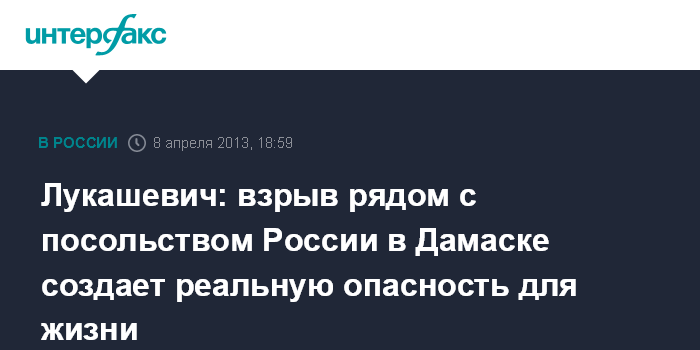 Москва. 8 апреля. INTERFAX.RU - В Москве решительно осуждают взрыв, который произошел в Дамаске вблизи российского посольства и заявляют, что это создает реальную опасность для безопасности российских дипломатов.
