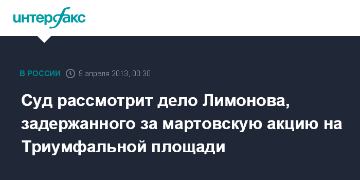 Москва. 9 апреля. INTERFAX.RU - Тверской суд Москвы во вторник рассмотрит дело в отношении оппозиционера и писателя Эдуарда Лимонова, задержанного на Триумфальной площади 31 марта за проведение несогласованной с властями акции.