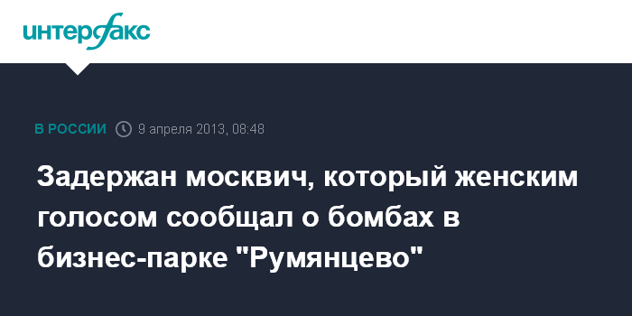 Москва. 9 апреля. INTERFAX.RU - Задержан подозреваемый в неоднократных сообщениях об угрозе взрыва в бизнес-парке "Румянцево", звоня в полицию, он имитировал женский голос, сообщили "Интерфаксу" в пресс-службе ГУ МВД России по Москве.